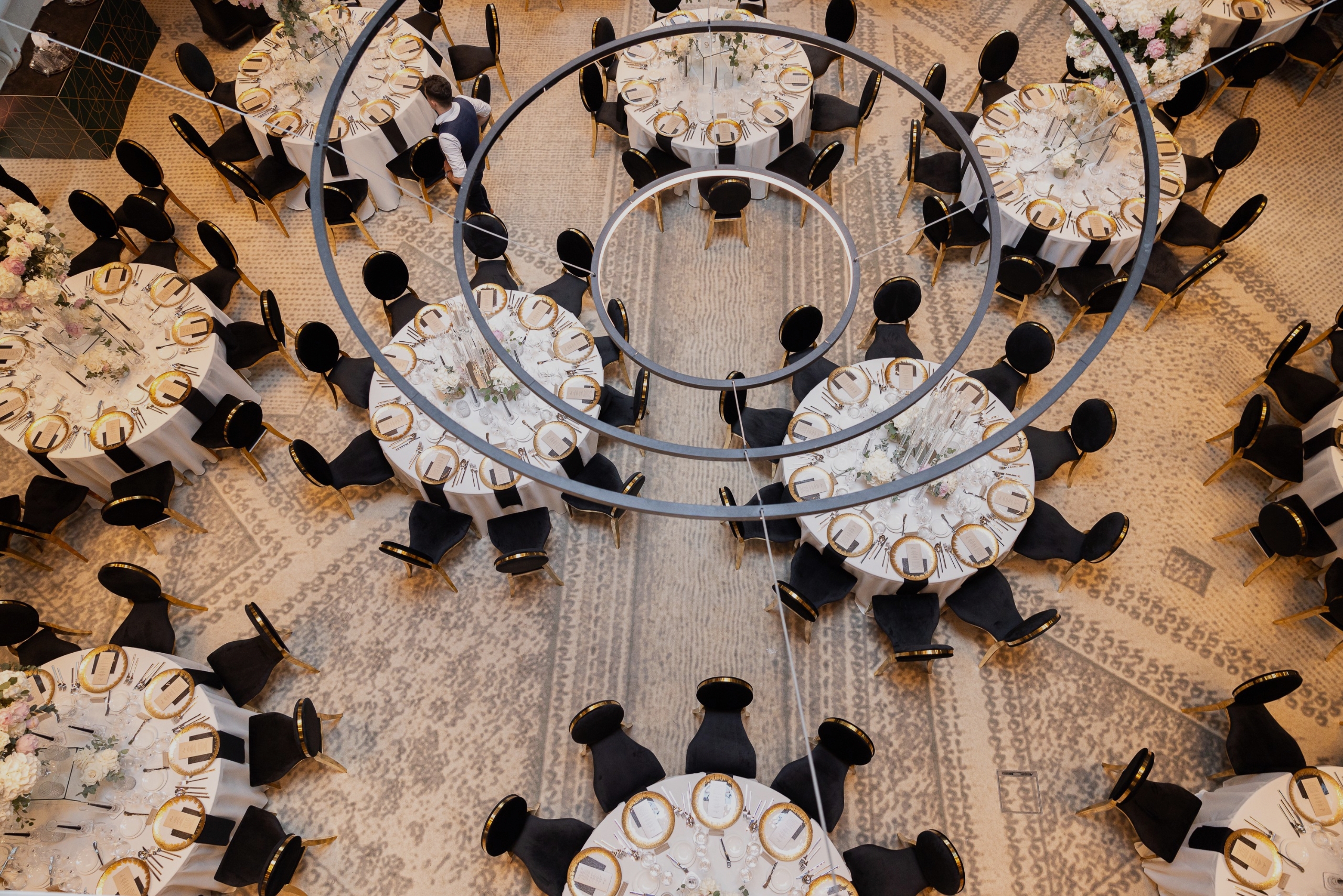 Okrągłe stoły z białymi obrusami, numeracja stołów, eleganckie nakrycia.